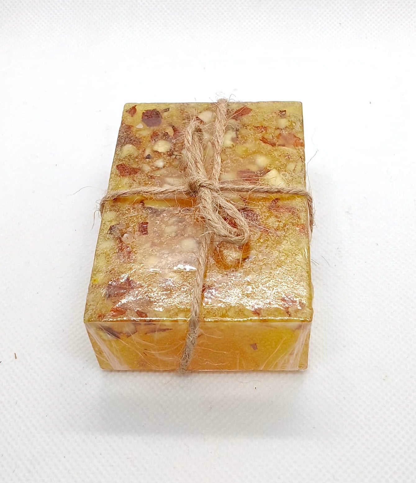 Nuestro jabón artesanal está elaborado con limón, cúrcuma y cáscara de mandarina, una mezcla cítrica y vibrante que limpia, renueva y despierta los sentidos.